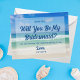 Ce magnifique mariage sur la plage Will You Be My Bridesmaid card présente une magnifique photo des vagues de l'océan pour un mariage de destination. Jolie photographie de plage associée à une élégante typographie bleue crée une carte chic et moderne de proposition de fête de mariée pour un événement d'île tropicale.