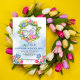 © Socialite Designs & LICENCORS. Cute lapin au repos Invitation de Pâques avec tulipes et oeufs de Pâques. Une merveilleuse invitation à la famille et aux amis invitations pour un brunch de Pâques et une chasse aux oeufs pour les enfants.