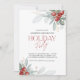 Invitation classique de fête de bureau avec élégante verdure d'hiver et baies. Le design est accentué de texte de style manuscrit tendance rouge.