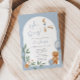 Célébrez la future maman avec cette invitation au baby shower bleu doux et mignon et lunatique avec une aquarelle illustrant des jouets vintages, des étoiles et une arche avec des feuilles d'eucalyptus verts et des amis animaux farcis avec un ballon.