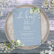 Une élégante invitation à la baby shower élégante avec une typographie élégante et une jolie végétation botanique sur un arrière - plan bleu poussiéreux. Conçu par Thisisnotme©
