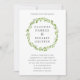 Faire-part de mariage rustique avec une grande couronne composée de feuilles d'oliviers verts. À l'intérieur de la couronne se trouvent vos prénoms et noms de famille dans tous les casquettes d'une police serif. Vous trouverez ci-dessous les détails dans une police gris moyen. L'arrière est une teinte verte assortie et peut être changée en n'importe quelle couleur. Ce design est parfait pour un mariage d'été.