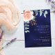 Un arrière - plan bleu marine. La couleur bleue est inégale. Décoré d'or rose et de fleurs roses rousses, de fleurs roses et de feuilles d'eucalyptus vert aquarellés, de sprigs, de verdure et d'une fausse feuille d'or. Personnalisez et ajoutez vos noms et détails. Texte blanc et doré. Retour : bleu marine arrière - plan inégal couleur.