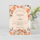 Pour une mariage élégante et romantique. Un arrière - plan de couleur pêche douce décoré de fleurs orange, pêche et rose. Cadre en arc. Personnalisez et ajoutez vos noms et détails. Dos : couleur pêche.