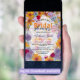 Présentez notre invitation à la douche nuptiale personnalisable qui dégage un mélange d'élégance et de fantaisie. L'invitation présente un design floral complexe comme son arrière - plan, orné d'un ensemble de fleurs en pleine floraison. Les fleurs, crées dans différentes teintes d'orange, de jaune, de violet et de rouge, créent une ambiance festive et un sentiment de joie. Les détails de l'événement sont soigneusement présentés dans des polices élégantes, assurant la lisibilité contre l'arrière - plan floral animé.