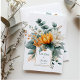 Invite your guests with the warm, sophisticated charm of this elegant wedding invitation. The design features a stunning, painterly watercolor bouquet rendered in a chic, modern palette. A magnificent warm orange flower, resembling a protea or lotus, provides a striking focal point, beautifully complemented by lush, creamy white anemones or peonies with detailed centers. This exquisite arrangement is artfully interwoven with delicate clusters of small orange berries and abundant sprays of dusty sage and blue-green eucalyptus leaves, creating a fresh, natural, and contemporary feel. The bouquet gracefully surrounds a minimalist, thin double-line gold rectangular frame, all set against a clean white background. Ideal for spring, summer, or autumn weddings with a modern, elegant theme, this invitation design is also perfect for sophisticated bridal showers, garden parties, anniversary celebrations, or milestone birthday events. This versatile design can also be adapted for stylish corporate events, seasonal promotions, or elegant announcements requiring a touch of refined floral beauty.
