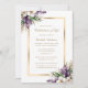 Elégante fête florale blanche et or de la vie invitation avec cadre doré orné d'orchidées violettes et blanches et de verdure. Un cadre photo fleuri à l'arrière.