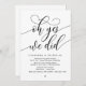 Marquez le début de votre éternité avec élégance en utilisant notre carte d'invitation à la célébration de l'élévation mariage contemporaine à thème noir et blanc, "Oh oui nous l'avons fait". Parfait pour les couples qui souhaitent profiter de leur joyeux événement, cette invitation exhale le raffinement avec un soupçon de jeu, préparant le terrain pour un événement mémorable. Décoré avec un thème design contemporain intemporel, il ajoute une touche de charme raffiné à vos festivités. Conçu par TeeshaDerrick, cette invitation promet de capturer magnifiquement votre histoire d'amour.