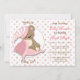 Cette mignonne invitation au baby shower présente un adorable et somptueux petit ours en peluche marron avec casquette rayé rose et blanc et couvertures roses. L'image est encadrée dans un cercle mince de lignes brunes, et placée contre un arrière - plan de polkadot rose et marron. Il y a un champ de texte personnalisé en marron en haut et en bas, et vos informations sont en rose foncé et en marron à droite. Le dos de l'invitation est rose assorti. Assurez-vous de voir les produits correspondants dans notre magasin.