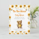 Invitez vos amis et votre famille à célébrer votre baby shower avec cette invitation mettant en vedette un ours en peluche mignon déguisé en abeille. Deux abeilles volent près des mots "Ba-Bee Shower" sur un fond de jolies fleurs jaunes à centre marron. Tout le texte peut être facilement modifié pour correspondre à vos informations.