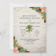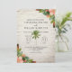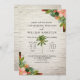 Une faire-part de mariage avec des fleurs tropicales et des feuilles en haut à droite et en bas à gauche avec un cocotier au centre. L'Arrière - plan est en brique blanche.
