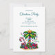 Une invitation de Noël avec une image de vacances saisonnière. Un palmier tropical orné de lumières festives surmonté d'une étoile. Un sucre de canne géant rouge et blanc qui sort du sable. Cadeaux de Noël sous l'arbre. Whimsical et amusant.
