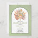 Sage green arch mariage de répétition invitation à dîner avec des feuilles de palmiers séchés tropicaux, pampas herbe et des fleurs de protéa. Un cadre en arc sur un arrière - plan vert sage et coloré encadre ce joli design mariage. Un bouquet d'aquarelle de feuilles de palmiers séchés, de fleurs de protéa et d'herbe de pampas est exposé dans le cadre.