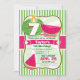 Mignonne pastèque rose et vert, enfant d'été, garçon ou fille invitation à la fête d'anniversaire sur vert clair et blanc rayures arrière - plan motif. Personnalisez ce mignon invitation avec le nom de votre enfant. Comprend une bougie de 7e, 7e anniversaire qui peut être personnalisée selon l'âge de votre enfant. Parfait pour l'anniversaire de naissance, le tout-petit, les jeunes enfants ou les enfants plus âgés. Grand invitation pour la pastèque, les fruits, la nourriture d'été thème fête d'anniversaire.