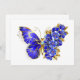Bijoux, bleu, saphir, papillon aux fleurs pétillantes avec aile décorée de bleu, fleurs précieuses avec feuilles d'or sur arrière - plan blanc.