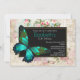 Une invitation de fête d'anniversaire de 50e (ou autre âge). Conçu avec un élégant papillon vert. Un cadre noir avec une bordure en or en dessous. L'arrière-plan est un motif de collage vintage avec des roses et un look vieillot et désuet.