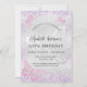 Une invitation d'anniversaire moderne et élégante. Fond de couleur argent faux orné de paillettes violettes, de papillons roses et d'un papillon argenté en filigrane. Personnalisez et ajoutez vos noms et détails de mariage. Lettres de couleur noire.