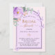 Arrière - plan de couleur pêche avec arche violette et violette. Décorée d'une fleur rose violette, d'une végétation d'eucalyptus vert aquarellée et de papillons. Personnalisez et ajoutez le nom de la mariée à être et les détails du parti.