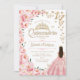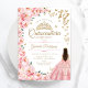 Invitation à la célébration de Quinceanera, rose vif, blanc doré et floral. En vedette brune fille en robe de robe de bal, police de script, papillons d'or, roses rose rousse et tiara. Parfait pour une élégante célébration de glamour de style princesse. Personnalisez avec vos propres détails. Invitations Zazzle imprimées ou téléchargement instantané modèle imprimable numérique.