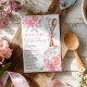 Une invitation à la douche nuptiale ludique et charmante, avec des ustensiles de cuisine attachés avec un ruban rose, entourés de fleurs peintes à la main et de papillons flottants. Ce design léger est parfait pour célébrer la future mariée avec une cuisine ou une douche à thème recette. La palette d'aquarelle douce ajoute une touche romantique, féminine, mêlant le blush, la pêche et les teintes coralliennes. Un texte modifiable facilite la personnalisation de votre journée spéciale, que vous planifiez un brunch jardin ou un thé de l'après-midi.