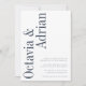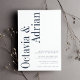 Un faire-part de mariage moderne et minimaliste à base de typographie avec vos noms dans les lettres classiques bleu marine fumé serif, en courant verticalement vers le côté gauche de la carte. Personnalisez avec vos détails mariages alignés en bas à droite.