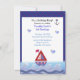 Un voilier bleu et rouge mignon navigue sur une mer ondulée. Des oiseaux bleus dans le ciel et une bordure rayée. Prêt à customiser pour votre fête d'anniversaire.