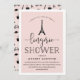 Ooh la la ! Invitations invités à une douche de lingerie pour que la mariée soit dans le style chic parisien. Nos élégantes invitations à la douche en lingerie rose et noir avec illustration de la tour Eiffel et typographie noire moderne mais fantaisiste. Les cartes renversent vers notre motif Paris Romance avec de minuscules croissants, macarons, oiseaux, roses, vélos et tours Eiffel.