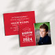 Annoncez votre baccalauréat ou diplômé de l'université en style avec cette faire-part de remise de diplômes et l'invitation de la fête. La carte recto-verso présente un portrait supérieur du diplômé avec un casquette de grade et un design simple et moderne de typographie blanche. L'arrière - plan rouge peut être changé en une couleur différente avec la fonction "Customiser", puis Éditer / Arrière - plan pour sélectionner une autre couleur.