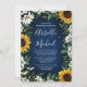 Le design comprend un arrière - plan en bois de grange bleu marine décoré de marguerites aquarelles, tournesols, verdure, eucalyptus, souffle de bébé et lis de la vallée.
