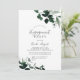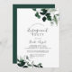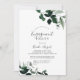Cette invitation de fête émeraude verte est parfaite pour un événement fiançailles boho. Le design élégant et rustique présente des feuilles d'aquarelle vert foncé moody et des eucalyptus aux tons bohèmes modernes.