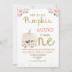 Filles Parties scintillant Calligraphie Citrouille 1er Anniversaire Sweet et simple fille's citrouille à thème d'anniversaire invitation pour un premier anniversaire avec un citrouille blanc et des lettres de parties scintillant faux. Le design présente également quelques arrangements floraux dans le feuillage rose et bleu vert. Le dos de l'invitation est un motif rose plaid. Ce design est idéal pour une fête de premier anniversaire sur le thème du citrouille, dans un décor rose, or et blanc.