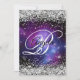 Une élégante invitation monogrammed 50e anniversaire 5x7 pour elle. Parties scintillant argent Faux avec étincelles contre une photo céleste noire, violette et bleue. On peut customiser le monogramme de calligraphie noir et blanc au centre. Tous les éléments argentés brillants de ce design moderne sont des graphismes numériques. Vous pouvez transférer la conception monogrammée sur le devant à un cadeau correspondant de petite ou moyenne taille.