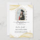 Une invitation à la remise de diplômes avec photo personnalisée et calligraphie stylisée avec l'or et l'arrière - plan blanc. Décoré de fausse poussière d'or. Personnalisez et ajoutez un nom et des détails du parti. Le nom est écrit avec un script de style manuscrit