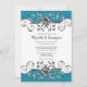 Le design présente un design turquoise en faux parties scintillant bleu turquoise avec des tourbillons ornementaux en argent et des embellissements de photo en pierres précieuses. Trouvez les articles correspondants dans notre suite mariage complète avec cette élégante parties scintillant turquoise design.