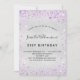 Pour un 21ème anniversaire élégant (ou tout âge). Un arrière - plan métallique à l'aspect faux argenté. Décoré avec de la poussière de parties scintillant en faux violet. Personnalisez et ajoutez un nom, un âge et des détails de la fête. Le nom est écrit avec un script de style manuscrit