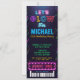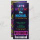 Fêtez votre fête d'anniversaire avec notre invitation de billet Neon Glow. Billet pass Caractéristiques futuristes lustrons le texte sur arrière - plan sombre. Ce design branché est parfait pour les roller disco ou les fêtes éclatantes.