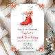 Cette invitation à l'anniversaire d'aquarelle élégante et festive comprend une botte de patinage sur glace rouge aquarelle et de belles fleurs de poinsettia rouge floral. Le texte combine écriture manuscrite et polices sans serif pour un look élégant et moderne. C'est parfait pour les fêtes d'hiver et de Noël.