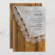 Invités Invitations à votre fête avec le rustique chic Country Lace Baby shower Invitation. Ce charmant invitation à thème de ranch personnalisé présente une photo pittoresque d'un mouchoir taillé en dentelle blanc cassé et d'un arrière - plan en bois de grange brun.