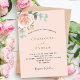 Arrière - plan coloré à la pêche. Décoré d'or rose et de fleurs rose rousse, de fleurs roses et de feuilles d'eucalyptus vert couleur eau, sprigs, de la verdure et des sprigs faux or. Personnalisez et ajoutez vos noms et les détails du mariage.