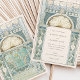 Ce magnifique faire-part de mariage Art Nouveau présente une illustration complexe d'inspiration vintage, avec des détails floraux délicats et un élégant motif paon. Le cadre magnifiquement orné, inspiré des arts décoratifs du début du XXe siècle, présente des verdure douce, des dorures chaudes et des tons terreux, créant une esthétique intemporelle et sophistiquée. L’avant de l’invitation présente avec élégance les noms et les détails mariages du couple dans une police serif raffinée, s’harmonisant parfaitement avec les éléments botaniques et architecturaux détaillés. Le dos poursuit le design luxueux, faisant de cette invitation une véritable oeuvre d'art. Parfait pour les mariages vintages, botaniques ou classiques, cette invitation évoque un sentiment de grandeur et d'amour. Imprimée sur papier de haute qualité avec des options personnalisables, cette invitation est idéale pour les couples à la recherche d'une suite de papeterie mariage unique, artistique et intemporelle.