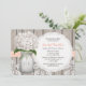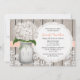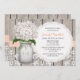 Les invitations nuptiales décorées d'un monogramme de douche de pot de maçon de style assez rustique avec des fleurs blanches d'hortensia et une barrière et une damassé en bois d'antiquité modèlent l'arrière - plan de dentelle et la pêche pâle piquée allument le ruban de corail. Ces invitations peuvent être personnalisés avec les initiales et le monogramme des jeunes mariés sur le pot de maçon. Ces invitations sont parfaits pour un wedding shower de style de pays, de ferme, de réception en plein air ou de basse-cour. Conçu par Chrissy H. Studios, LLC.