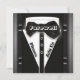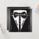 Des invitations à des événements et à des fêtes d'anniversaire branchées, cool et élégantes avec des modèles de texte personnalisables. DESIGN - Un élégant arrière - plan gris en métal mitraillé encadre un tuxedo noir et blanc avec cravate à l'arc.