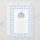 Célébrez l'arrivée de votre petit citrouille avec notre charmante invitation baby shower, conçue dans un ravissant motif bleu en vichy. Cette invitation au baby shower garçon est ornée d'un motif citrouille adorable, ce qui en fait un lieu idéal pour accueillir une nouvelle addition à la famille. Invitation vos proches à partager la joie de cette occasion spéciale avec une touche de charme saisonnier.