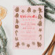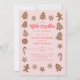 Carte d'invitation à baby shower à thème de Noël, lunatique et sucrée, avec illustration dessinée à la main de biscuits de vacances. Le texte dit "notre petit cookie est en route." L'arrière - plan est rose et parfait pour un baby shower de fille.