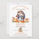 Petit champignon mignon hérisson avec champignons fête d'anniversaire modèle invitation instantanément télécharger, un mignon hérisson aquarelle dans une veste tenant de petits champignons et champignons à côté de lui pour les soirées d'anniversaire thème automne.