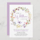 Une élégante invitation à prendre une douche pour bébé avec "un petit fleur sauvage est en route" écrite dans un mélange de typographie moderne gris et d'un script élégant lavande violet, et aquarelles d'inspiration boho d'une couronne de fleurs sauvages violet, rose, pêche et jaune et d'un papillon violet. Personnalisez le nom et les détails de la douche de la mère en lavande simple et en typographie grise.