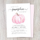 Une invitation à la douche d'un couple de petite fille en automne mignonne avec "A Sweet Little Citrouille is On Her Way" écrite en typographie grise et un script élégant, et une aquarelle rose pastel d'un citrouille. Personnalisez le nom de la mère et les détails de la douche dans une simple typographie.