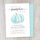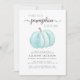 Une mignonne invitation à la douche bébé automne avec "Un petit Citrouille doux est en route" écrit en typographie grise et un script élégant, et une aquarelle bleu pastel d'un citrouille. Personnalisez le nom de la mère et les détails de la douche dans une simple typographie.