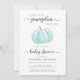 Une invitation à la douche pour bébé mignonne, joyeuse et lumineuse avec "Un petit Citrouille doux est en route" écrite dans un mélange de typographie moderne gris doux et de script élégant, et une aquarelle bleu pastel d'un citrouille. En dessous, "baby shower" est écrit dans le même script élégant et vous pouvez personnaliser le nom de la mère et les détails de la douche dans une simple typographie.
