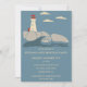 Tout le texte sur cette invitation est prêt à être customisé pour vous permettre de créer l'invitation parfaite pour les fêtes d'anniversaire et autres événements spéciaux. Il a une simple illustration nautique d'un phare en rouge, crème ou ivoire. Le phare se dresse sur une côte rocheuse avec des vagues qui s'écrasent en contrebas et des nuages crème dans le ciel. Le graphique est positionné contre un arrière - plan bleu français doux.